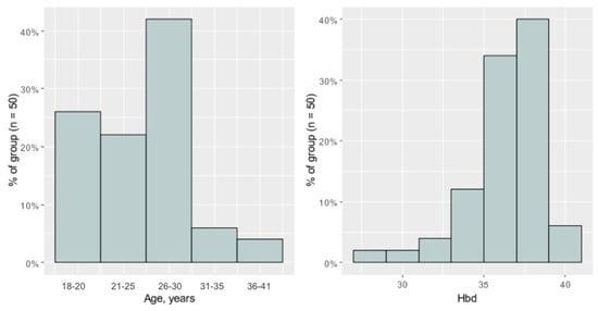 Histograms of age and Hbd (week of pregnancy) in the study group.