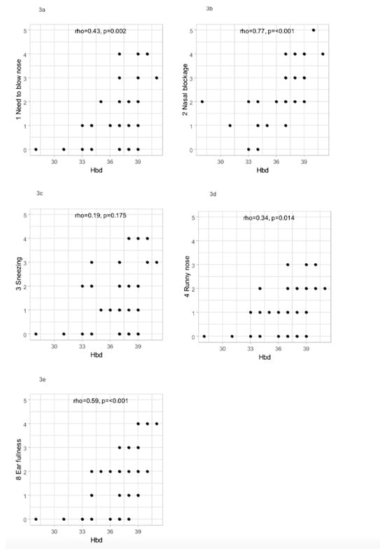 (a–e) Scatterplot presenting relationships between Hbd and selected SNOT-22 outcomes.