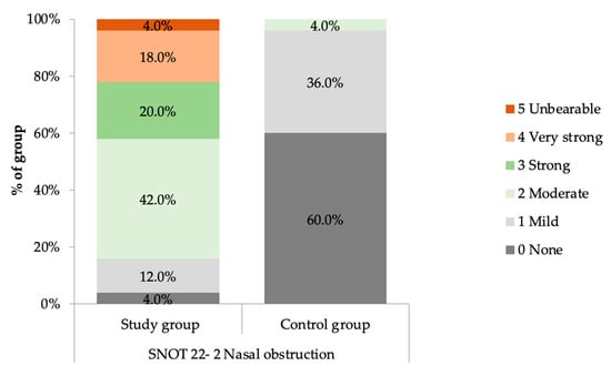 Severity of nasal obstruction in the study group and control group, based on SNOT-22 questionnaire.