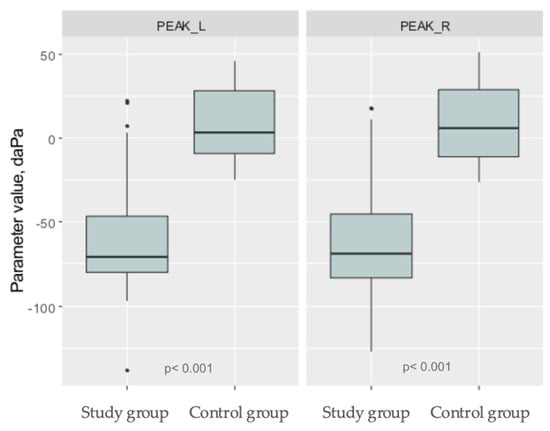 Boxplots representing level of analyzed tympanometry parameters in research group and control group. PEAK L- parameter value in left ear. PEAK R- parameter value in right ear.