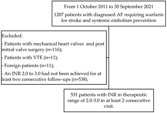 The present study was a single-center, retrospective cohort study of patients who were enrolled between 1 October 2011 and 30 September 2021 at a referral hospital. The study included patients with AF, categorized into two main types: non-valvular AF and rheumatic mitral stenosis-associated AF. Non-valvular AF refers to AF occurring in the absence of significant valvular disease, such as mitral valve stenosis or mechanical heart valves. This subgroup comprised patients with AF not attributable to valvular abnormalities and accounted for the majority of cases in the study population. The inclusion criteria of the study were as follows: (i) patients had AF, regardless of whether they presented with the first episode or recurrent episodes of AF, (ii) patients had undergone continuous warfarin therapy with the target INR of 2.0 to 3.0 at the Outpatient Clinic for more than three months, regardless of their initial OAC treatment status, including the potential use of LMWH, and (iii) patients had achieved INR targets for at least two consecutive follow-up visits. Sequential exclusion criteria were applied to mitigate confounding factors and ensure the homogeneity of the study cohort. These criteria included the exclusion of patients with mechanical heart valves, post-mitral valve surgery, venous thromboembolism (VTE), foreign patients, and those failing to achieve therapeutic INR levels (2.0 to 3.0) for at least two consecutive follow-up visits, as shown in Figure 1. The electronic medical records of patients were reviewed. Baseline characteristics, including age, body weight, body height, comorbidities, concurrent medications, actual warfarin dose, and INR levels, were collected. The study protocol was approved by the institutional Medical Ethics Committee project approval number S002b/65ExPD.
