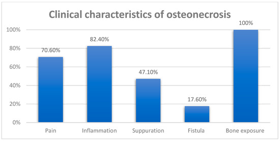 Bone exposure was the most observed clinical sign, present in 100% of the cases. This result may be a reflection of a late diagnosis. No patient in our sample was diagnosed with stage 0, in which there are no clinical signs of necrotic bone. However, there are nonspecific clinical findings, symptoms and radiographic changes. In this case, the symptoms that may be present are odontalgia without apparent cause, mandibular bone pain that may radiate to the temporomandibular region, sinus pain that may be associated with inflammation and thickening of the maxillary sinus wall and altered sensorineural function [19]. In this study, 70.6% of the patients presented orofacial pain. Clinically, inflammation was observed in 82.4% of the cases, 47.1% presented suppuration, followed by the presence of a fistula, present in 17.6% of patients.