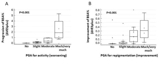 3.5. Stratification of the Percentage Change in VESplus According to the PGA Activity (Worsening) and Repigmentation (Improvement)