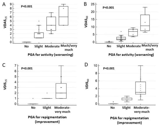 van Geel, N.; Delbaere, L.; Mertens, L.; Vandaele, V.; Depaepe, L.; Van Causenbroeck, J.; De Schepper, S.; Van Coile, L.; Van Reempts, A.; De Vos, A.-S.; et al. Exploring the Severity Strata of Disease Activity and Repigmentation in Vitiligo Based on Validated Physician Global Assessment (PGA) Scores. J. Clin. Med. 2024, 13, 2680. https://doi.org/10.3390/jcm13092680
