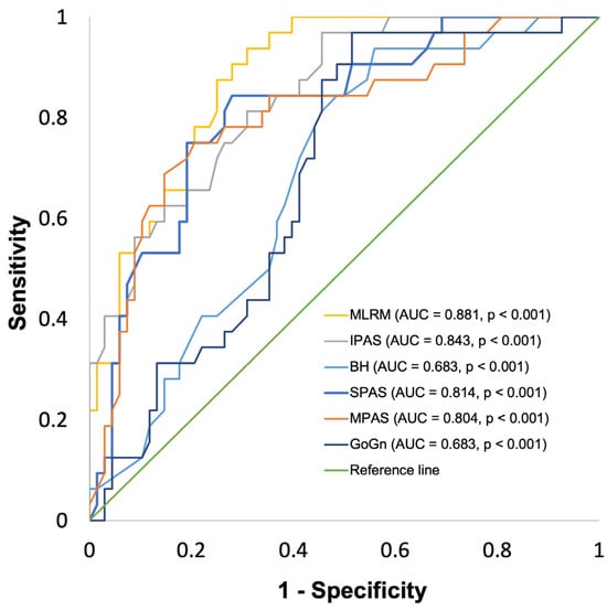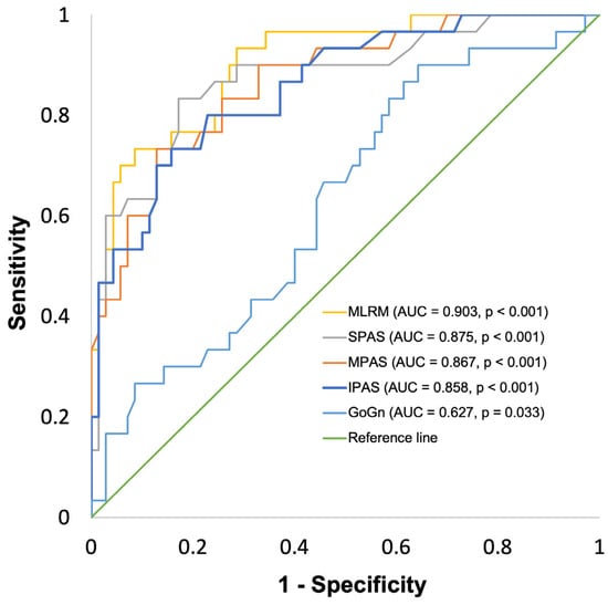 VPAS ≤ 12.0 cm3 (n1 = 32; n2 = 68) was tested as a binary classifier against the MLRM, predicting VPAS as well as the individual model components, or rather the four two-dimensional CPs with the strongest individual correlations to VPAS. The multiple linear regression model for VPAS led to an AUC of 0.881 [0.821–0.947] (p < 0.01). IPAS led to an AUC of 0.843 [0.767–0920] (p < 0.01), and BH led to an AUC of 0.683 [0.578–0787] (p < 0.01). SPAS led to an AUC of 0.814 [0.726–0902] (p < 0.01), MPAS led to an AUC of 0.804 [0.708–0900] (p < 0.01), and GoGn led to an AUC of 0.683 [0.578–0.787] (p < 0.01).