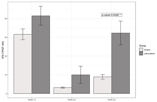A repeated-measures analysis of variance (ANOVA) with factors group (at term, preterm) and time (12, 24, 32 weeks) was conducted to test whether the ratio sFlt-1/PlGF levels across the three distinct time points differed between groups. By incorporating a random effect using an identification for each patient, the model accounted for individual variations among patients. Statistically significant differences were found between the observed sFlt-1/PlGF ratio at week 32 based on the presence of late preterm birth (p = 0.0026, corrected by the Tukey test for multiple comparisons), as seen in Figure 1 and Table 2.