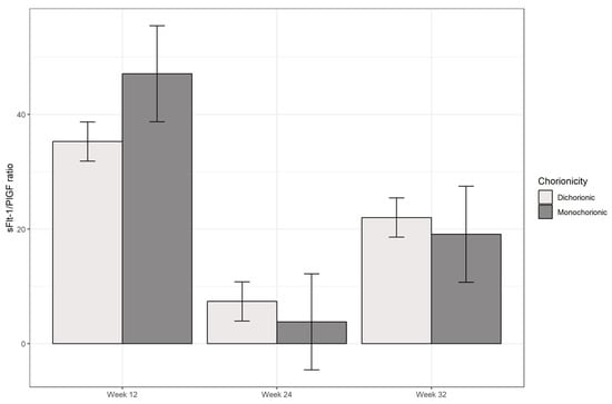 This was a prospective cohort study among both mono and dichorionic twin pregnancies that were followed up at the University and Polytechnic Hospital La Fe, Valencia, Spain, from February 2021 to September 2023. The evolution of the sFlt-1/PlGF ratio during pregnancy was monitored at 12, 24, and 32 weeks of gestation using Elecsys® immunoassay sFlt-1/PlGF ratio (Roche Diagnostics, Basel, Switzerland) in an outpatient setting. Serum samples were immediately analyzed (<6 h) after the collection. Gestational age, chorionicity, and amnionicity were defined by ultrasound on the first-trimester evaluation (11+0 to 13+6 weeks of pregnancy).