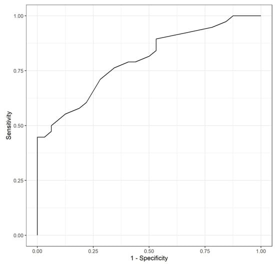 After evaluating the relationship between the three determinations with the occurrence of preterm birth through a logistic regression model, it was found that the OR related with the sFlt-1/PlGF ratio at week 32 was statistically significant (coefficient = 0.107147; p = 0.00104), with an associated OR of 1.11 (1.05–1.20). The changes between all three measurements were also evaluated, and statistically significant differences were found in the evolution between weeks 24 and 32 (ascending levels of sFlt-1/PlGF), with a 1.1 OR (1.05–1.19; p = 0.005). This means that the increase of one unit of sFlt-1/PlGF ratio difference between week 24 and week 32 increased the probability of presenting a preterm birth with respect to not presenting this event by 1.1. Furthermore, it was evaluated if adding other data increased the predictive power of sFlt-1/PlGF alone concerning preterm birth. A logistic regression model combined the parity, maternal age, conception method, and BMI with the sFlt-1/PlGF ratio level at week 32. The model presented statistically significant results with respect to the null model (p = 0.0002) but did not statistically improve the predictive value of the sFlt-1/PlGF ratio alone (Likelihood ratio test, p > 0.05). Therefore, we proposed to use the most parsimonious model, including only the ratio alone instead of adding additional variables. As represented in Figure 3, an AUC-ROC curve was performed to analyze the predictive capacities of such a model. A ratio >12 at 32 weeks was related to a sensitivity of 71%, specificity of 72%, and an accuracy of 71%, with a positive predictive value (PPV) of 0.75 and a negative predictive value (NPV) of 0.68 for the identification of patients who develop preterm birth.