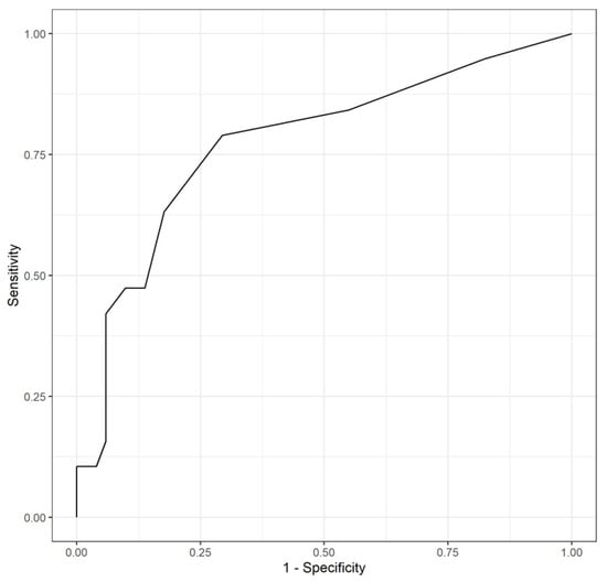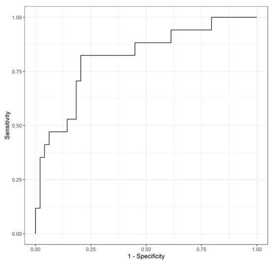 When evaluating the relationship between the three determinations of sFlt-1/PlGF ratio with the occurrence of an adverse perinatal event through a logistic regression model, statistically significant differences were found for week 24, with an OR of 1.24 (1.11–1.40; p = 0.0002). Thus, the increase of one unit of the sFlt-1/PlGF ratio increased the probability of presenting an adverse perinatal event secondary to prematurity by 1.40. The evolutive changes between the three measurements of the sFlt-1/PlGF ratio at 12, 24, and 32 weeks gestation were also evaluated, and statistically significant differences were found in the change between week 24 and 32 (ascending levels of sFlt-1/PlGF), with a 1.04 OR (1.01–1.07; p = 0.0301). Furthermore, it was also evaluated if adding other data increased the predictive power of the sFlt-1/PlGF ratio alone. Thus, parity, maternal age, conception method, BMI, and chorionicity were combined with ratio level at week 24, after standardizing data due to differences in scales. The model presented statistically significant results with respect to the null model for ratio at week 24 and chorionicity. Furthermore, it statistically improved the predictive value of the sFlt-1/PlGF ratio alone (Likelihood ratio test, p = 0.04). In this model, ratio levels at week 24 presented an OR of 314 (25–5795; p = 0.00002). Thus, an increase of one standard deviation meant increasing the probability of presenting an adverse perinatal event by 314. As for chorionicity, an OR of 6.88 (1.57–33.04; p = 0.01) was found for monochorionic pregnancies. Additionally, as represented in Figure 4, an AUC-ROC curve was performed to analyze the predictive capacities of the model, including the sFlt-1/PlGF ratio, for week 24 only. A sFlt-1/PlGF ratio at week 24 > 4 weeks was related to a sensitivity of 79%, a specificity of 71%, an accuracy of 73%, with a PPV of 0.50 and a negative predictive value NPV of 0.90, were found. This AUC-ROC curve was subsequently compared to a second one, which included all additional data (Figure 5), with higher predictive values: a sensitivity of 82%, a specificity of 80%, and an accuracy of 80%, with a PPV of 0.58 and a negative predictive value NPV of 0.93.