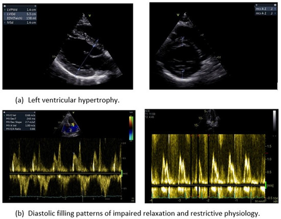 - Klein, A.L.; Hatle, L.K.; Burstow, D.J.; Seward, J.B.; Kyle, R.A.; Bailey, K.R.; Luscher, T.F.; Gertz, M.A.; Tajik, A.J. Doppler characterization of left ventricular diastolic function in cardiac amyloidosis. J. Am. Coll. Cardiol. 1989, 13, 1017–1026. [Google Scholar] [CrossRef] [PubMed]