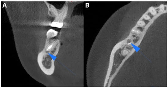 One of the cases misdiagnosed by the AI tool as a widened PDL space but classified as PL by human readers (blue arrows). Coronal plane (A), axial plane (B).