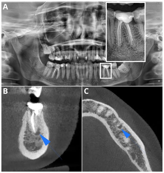 Sample false negative AI diagnosis in OPG, diagnosed by readers in OPG (A) (lesion magnified in white rectangle). PL confirmed in CBCT (blue arrows): coronal plane (B), axial plane (C).