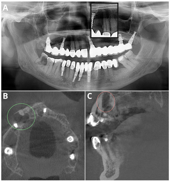 Sample false negative AI diagnosis in both OPG and CBCT evaluations, caused by high image noise from metal artifacts. In the OPG image, the lesion is magnified in the black rectangle (A). CBCT images of PL in color ovals in the axial plane (B) and sagittal plane (C).