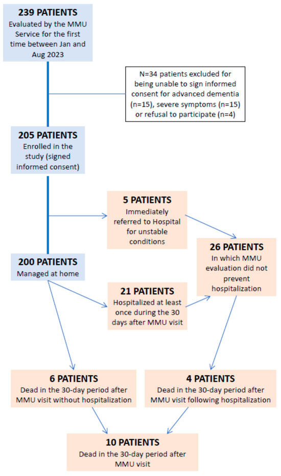 We considered for inclusion all patients who were visited at home by the MMU for the first time upon request from the general practitioner (GP) or an outpatient specialist service. Patients who agreed to participate and signed informed consent were finally included. The presence of an available caregiver willing to be contacted by phone for follow-up reasons was an additional inclusion criterion. Conversely, we excluded from the study all patients who were already followed up by the MMU at the moment of study start, physiologically unstable patients who required immediate hospitalization, and subjects unable to provide informed consent.