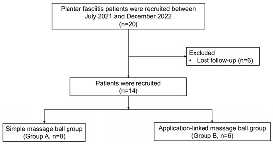 Twenty volunteers with symptoms of plantar fasciitis were recruited from the outpatient clinic of our hospital between July 2021 and December 2022. After screening, the participants were randomly divided into a simple massage ball group (group A) and an application-linked massage ball group (group B) and treated in a single-blind manner (Figure 1). For the assignment to groups A and B, a computer-generated random number table was employed. Six patients were lost to follow-up and were excluded from the final analysis. Therefore, eight patients in group A and six patients in group B were finally included. The application-linked massage ball sends information regarding the massage, such as the frequency and force of massage on the foot, to the application on the patient’s smartphone (Figure 2). We expected that the patients in Group B would be encouraged to be more motivated to undergo ball massaging than the patients in Group A by monitoring their volume of ball massages using an application installed on their smartphones. All study patients were educated using an informative brochure on the general principles of physiotherapy for the treatment of plantar fasciitis, such as rolling or Achilles tendon stretching.