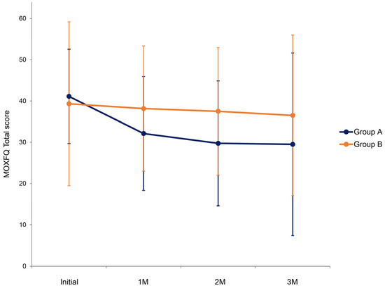 At the beginning of the study, the initial total MOXFQ scores showed no significant difference between the two groups (p = 0.948) (Table 3 and Figure 3). At each time point, the total MOXFQ score of the whole population did not improve significantly compared to that of the initial state (p = 0.131). GEE modeling demonstrated no significant difference in the improvement of the total MOXFQ score between groups A and B during follow-up (p = 0.826). No group-by-time interactions were observed (p = 0.457).