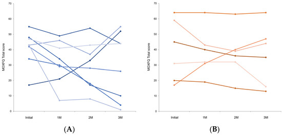 The MOXFQ total scores for individual participants in both groups generally decreased over the follow-up period compared with the initial state (Figure 4A,B). However, one participant in each group exhibited a consistent increase in their scores.