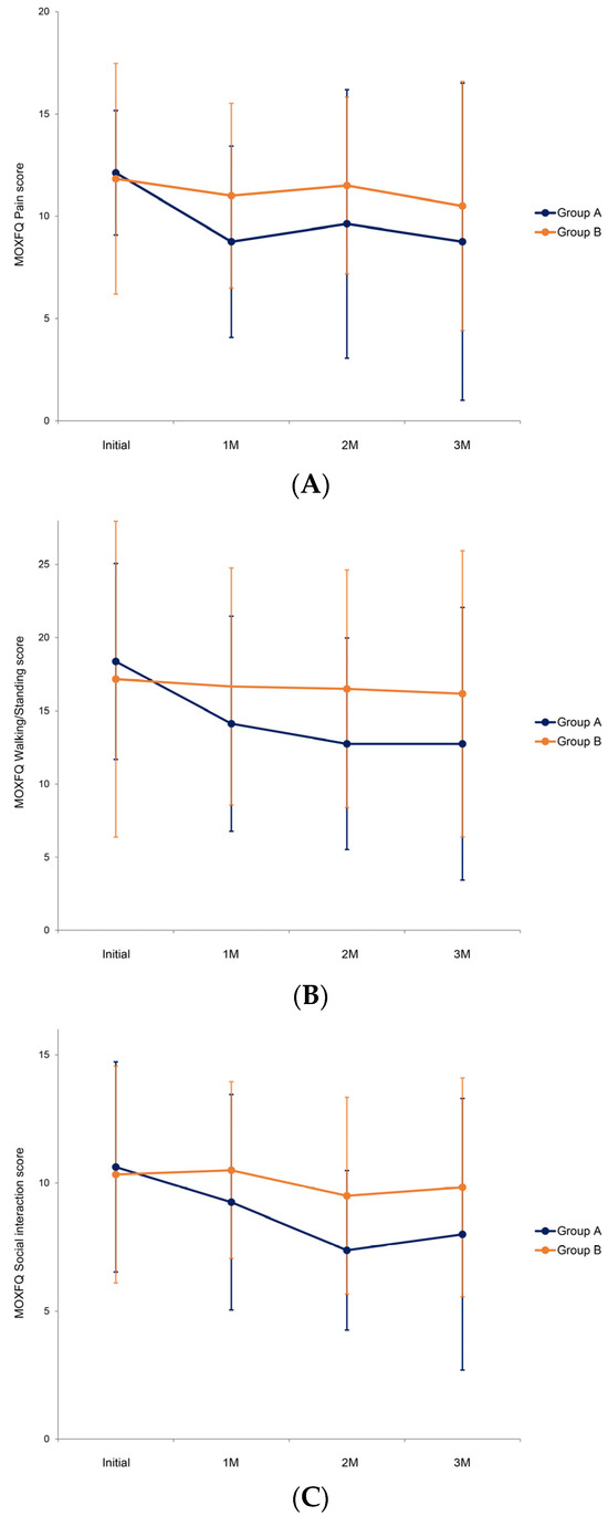Breaking down the total MOXFQ score into pain, walking/standing, and social interaction scores, we observed that, at the beginning of the study, the initial MOXFQ pain scores showed no significant difference between the two groups (p = 0.650) (Figure 5A). Throughout the study, the pain scores of the whole population did not improve significantly compared with the initial state (p = 0.260). GEE modeling revealed no significant difference in the improvement of the MOXFQ pain scores between groups A and B during follow-up (p = 0.990).