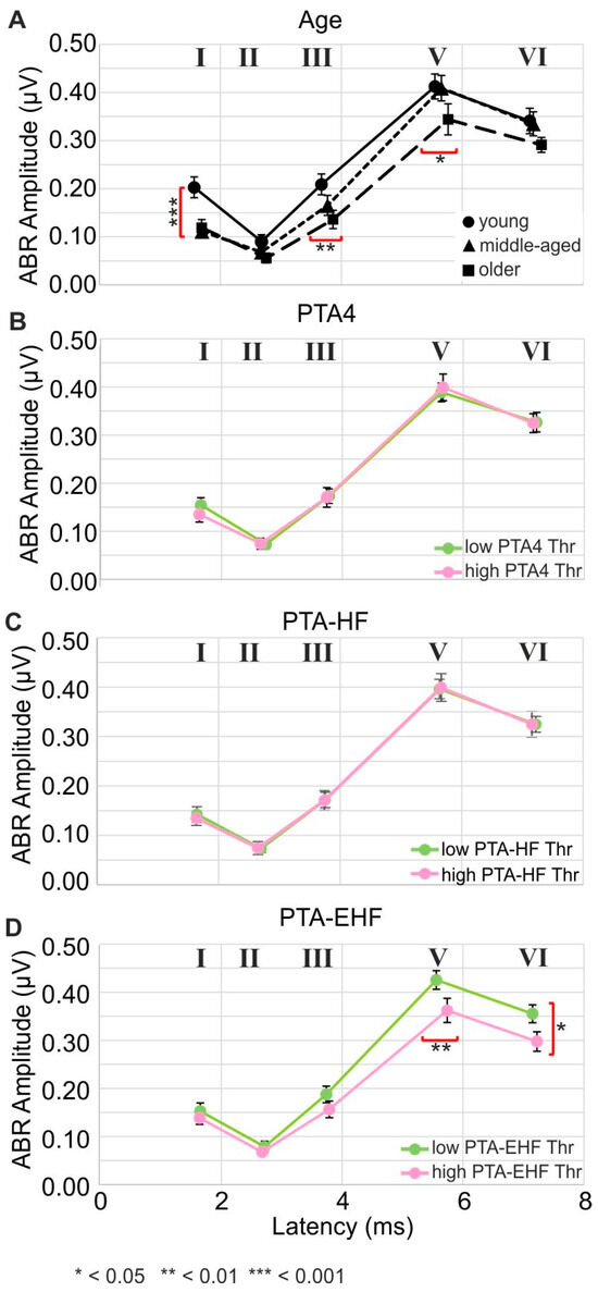 ABR as a function of age, pure-tone averages, and speech comprehension: (A) ABR wave amplitude and latencies grouped by age. Circles represent young, triangles middle-aged, and squares older participants. (B–D) ABR wave amplitudes and latencies grouped for participants with low (green) and high (pink) thresholds of PTA4 (B), PTA-HF (C), and PTA-EHF (D).