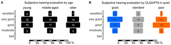 Subjective hearing evaluation by age and speech comprehension: (A) shows age groups and (B) groups according to objective speech comprehension performance based on OLSA thresholds corrected by PNOTs. y-axis: subjective evaluation, x-axis: percentage of all responses given by all participants in age groups (A) and in PNOT groups (B). Participants were asked to rate their hearing as excellent, very good, good, moderate, or bad (y-axis labels).