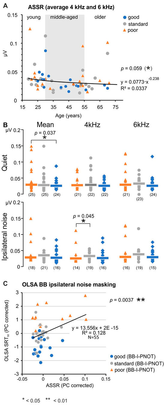 The averaged ASSR amplitudes were analyzed next as a function of age at both 4 and 6 kHz carrier frequencies (Figure 6A), and inspected for significance in groups with poor, standard, and good speech comprehension in quiet and in ipsilateral noise (Figure 6B) conditions. A tendency of lower amplitude with increasing age was noted for ASSR amplitudes at both 4 and 6 kHz carrier frequencies (shown for the average of 4 kHz and 6 kHz ASSR responses in Figure 6A), with nearly equal contribution of poor or good PNOTs along the different age.