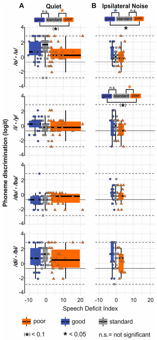For PNOT, the score of percent-correct answers was compared by Mann–Whitney U tests between good and poor performers, between poor and standard performers, and between standard and good performers (1-sided hypothesis: The group of poor/standard performers contains more participants with low-percentage correct scores relative to the standard/good performers. A resulting p-value equal to or smaller than α = 0.05 was considered statistically significant and noted as an asterisk in the respective figure panel (Supplementary Figure S1; Supplementary Table S4). A p-value smaller than 0.1 was noted with an asterisk in brackets to indicate a trend in the distribution, though not reaching statistical significance. Statistical comparisons were made for the percent-correct scores obtained for the “difficult” discrimination task (small spectral and temporal syllable contrast), and for the scores obtained for the “easy” discrimination task (larger spectral and temporal syllable contrast).