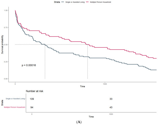 Patients undergoing transtibial amputation (738 days, Q1–Q3: 102–1507) had significantly higher median survival than patients with transfemoral amputations (247 days, Q1–Q3: 29–738, p-value: 0.009). Additionally, there was strong evidence for a higher median survival in patients living in a multi-person household, with 823 days (95%CI: 487–1460) compared to 344 days (95%CI: 202–515) in patients living alone (Figure 1A) (p-value: < 0.001).