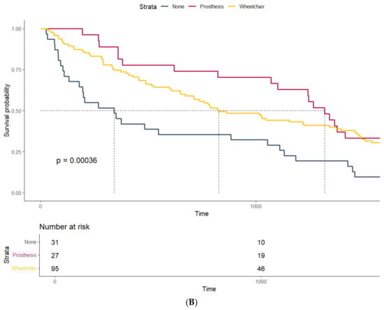 The survival of patients stratified by their mobility at discharge also differed significantly (p-value: <0.001): Patients with a prosthetic fitting had a median survival of 1320 days (Q1–Q3: 722–1819) compared to a median survival of 828 days (Q1–Q3: 356–1736) in patients dependent on a wheelchair after amputation. Patients confined to bed after surgery showed the lowest median survival, with only 342 days (Q1–Q3: 106–1121) (Figure 1B). However, this association might be confounded by the lower age of patients suited for prosthetic fitting and wheelchair users compared to those confined to bed after amputation (72.3 years vs. 72.1 years vs. 84.1 years).