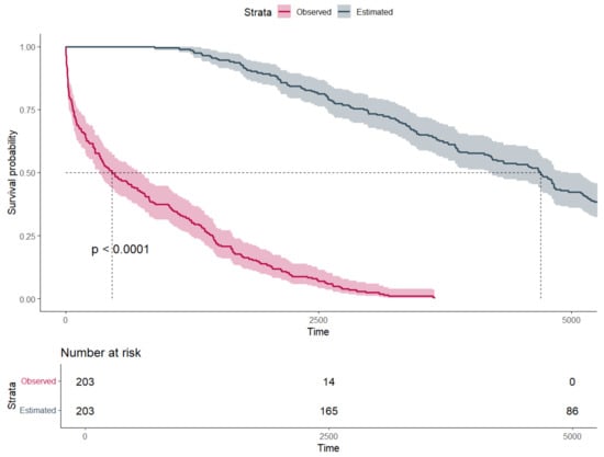 Survival probability estimated by Kaplan–Meier curves and stratified by estimated and observed survival (time in days).