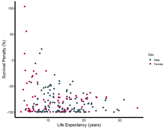 Survival penalty (in percent) plotted against estimated life expectancy (in years), stratified by sex.