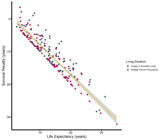 Survival penalty (in years) plotted against estimated life expectancy (in years), stratified by household size. The yellow line illustrates the associated linear regression including the 95%CI (gray-shaded area).