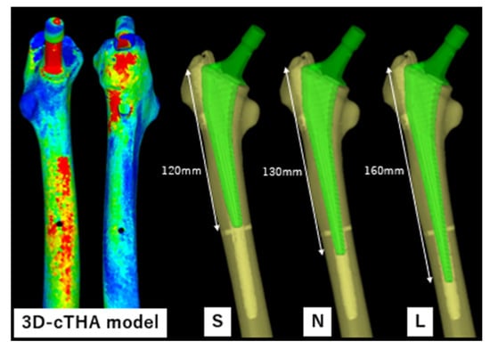 The STL data from the Universia stem were inserted into the removal model to create a cTHA model (Figure 1). The stems were divided based on their length into three groups: (1) short (120 mm stem, hereafter referred to as the S group); (2) normal (130 mm stem, N group); and (3) long (160 mm stem, L group) (Figure 1). In clinical practice, the 130 mm normal stem is the only one used, whereas the short and long stems were newly constructed virtual stems for this simulation. The long stem was selected based on previous studies that recommended a bridging length of approximately 40 mm for fractures or large cortical bone defects [39,40,41], and a stem length of 160 mm was used for verification.