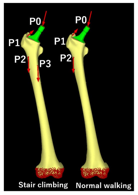 The loading conditions were based on the maximum load during daily activities. For this study, maximum loads during “normal walking” and “stair climbing” were adopted, based on previous reports [47,48]. The loads are shown in Table 2 and Figure 4, and the magnitude of each vector was determined based on the weight of the patient. The boundary conditions were set for full restraint at the distal femur (Figure 4), and the contact condition between the femur and stem was defined with a friction coefficient of 0.49 [49].
