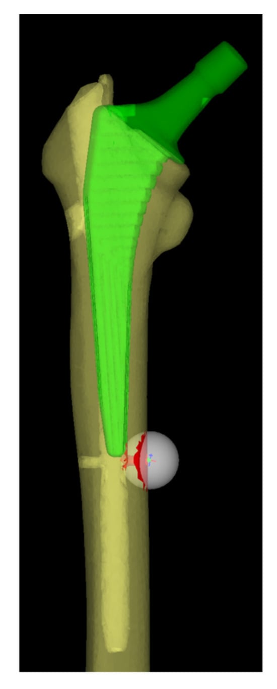 Regions of interest for stress value calculations. The target area of investigation was defined as the shell elements of the bone surface within a spherical region with a 10-mm radius centered on the distal screw removal hole.