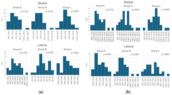 Histogram of the normality test performed using the Shapiro–Wilk test. (a) Normal walking; (b) Stair climbing. The collected data followed a normal distribution under both the normal and stair-climbing conditions.