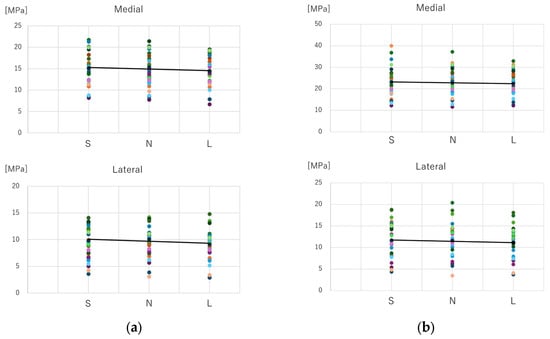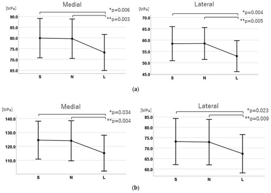 For the medial side, the stress was 79.9 (95% CI: 70.8–89.0) MPa for the S group, 79.6 (95% CI: 70.5–88.8) MPa for the N group, and 73.2 (95% CI: 64.9–81.6) MPa for the L group. For the lateral side, it was 58.4 (95% CI: 50.9–65.9) MPa for the S group, 58.5 (95% CI: 51.5–65.5) MPa for the N group, and 52.9 (95% CI: 46.0–59.8) MPa for the L group. Both medial and lateral sides showed significant main effects in the analysis of variance (medial side: F (2, 58) = 9.940, p < 0.001, η2 = 0.26; lateral side: F (2, 58) = 8.311, p < 0.001, η2 = 0.22) (Figure 9).