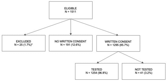 One thousand five hundred and eleven children attending 46 public preschools were eligible for vision screening at the time of the study. The mean age was 4.76 ± 0.76 years (range 3–6 years) and 51.3% were boys. Parents of 1295 children gave their written consent for their child to participate in the screening test, and a total of 1254 (96.8%) children were eventually tested (the remaining were absent on the day of the screening test or uncooperative during the test, Figure 1).