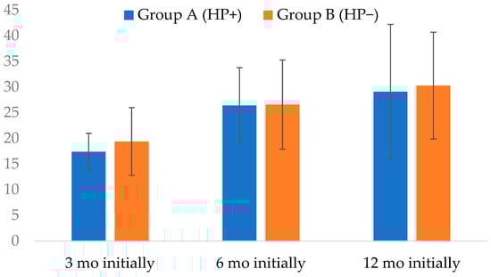 The mean body weight and BMI in our cohort at the time of operation were 113.1 kg (SD = 19.7) and 38.9 kg/m2 (SD = 5.3), respectively. There were no significant differences between study groups in terms of operational body weight (p = 0.2116) and BMI (p = 0.5323). In group A, which included individuals who tested positive for HP, there was a significant decrease in body weight at 6 and 12 months following surgery compared to the initial body weight (p < 0.0001), but not at 3 months. By contrast, in group B, there was a significant decrease in body weight at 3, 6 and 12 months following surgery compared to the initial body weight (p < 0.0001). In group A, there was a significant decrease in BMI at 6 months and 12 months following surgery compared to the baseline value (p = 0.0001), but not at 3 months. In group B, there was a significant decrease in BMI at 3, 6 and 12 months following surgery compared to the baseline value (p < 0.0001). Additionally, in group B, BMI further decreased significantly at 6 and 12 months compared to BMI at 3 months after surgery.