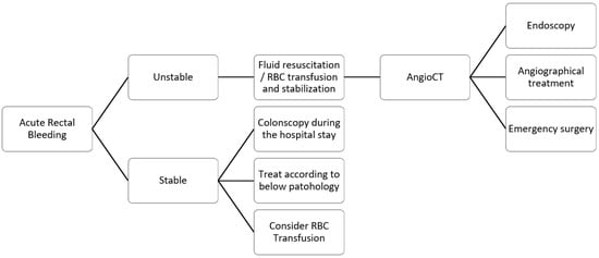 Flowchart for management of rectal bleeding (AngioCT, Angio-Computed Tomography; RBC, Red Blood Cell).