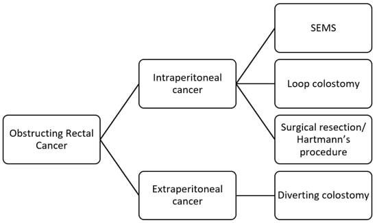 To define the appropriate management, it is crucial to assess the distance of the tumor from the anal verge (Figure 2). Patients with proximal lesions may benefit from endoscopic metal stents such as SEMSs, the creation of a diverting stoma, or surgical resection of the tumor. SEMSs can be introduced through a colonoscope, and it was initially used for palliative treatment. Today, a SEMS can serve as a “bridge to surgery”, resolving the obstruction without immediate surgical intervention []. This approach allows for optimizing the patient’s condition, tumor staging, possible neoadjuvant therapy, and the opportunity for elective surgery. A recent systematic review and meta-analysis [] found a technical success rate for this approach of 97% but a clinical success rate of only 69%, with an overall peri-procedure complication rate of 28%. Another meta-analysis [], pooling data from seventeen studies, demonstrated that long-term oncological outcomes are comparable between patients treated with SEMS as a bridge to surgery and those undergoing emergency surgery. However, while SEMS has been associated with increased long-term complications, such as delayed perforation, stent obstruction or migration, chronic pain, and local recurrence, it is associated with a lower rate of stoma formation. SEMS is also preferred over colostomy for palliation [,,].