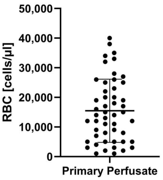 Initial perfusate samples revealed a mean red blood cell (RBC) concentration of 15,480 RBC/µL, ranging from 1000 RBC/µL to 40,000 RBC/µL, and a standard deviation of 10,658 (Figure 1).
