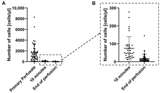 (A): Cell quantification of primary perfusate and at the time points “10 min” and “end of perfusion”; (B): smaller scale to focus on the cell quantification of the time points “10 min” and “end of perfusion”.