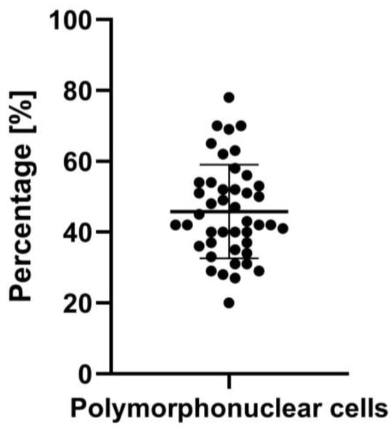 In 44 out of 50 cases, a detailed cell characterization was performed. The mean percentage of polymorphonuclear cells in the primary perfusate was 45.82%, with a standard deviation of 13.22% (Figure 3). The minimum was 20%, and the maximum was 78%.
