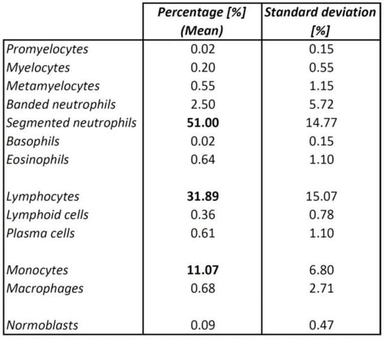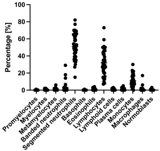 Smaller populations of the described other cell types were only detected for some of the 44 cases. Promyelocytes were detected in one case with a percentage of 1%. Myelocytes were detected in 6 cases, metamyelocytes in 12 cases, banded neutrophils in 18 cases, basophils in 1 case with a rate of 1%, eosinophils in 15 cases, atypical lymphocytes (lymphoid cells) in 9 cases, plasma cells in 14 cases, macrophages in 7 cases, and normoblasts in 2 cases. The respective mean percentages are, therefore, small (Figure 4; mean percentages and standard deviation in Figure 5).