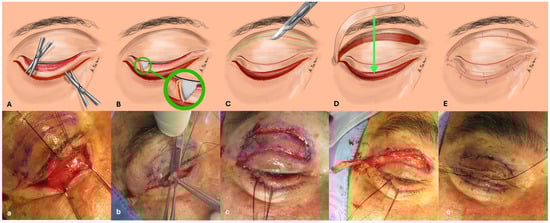 The last step of our combined procedure therefore consists of the transposition of a laterally based myocutaneous flap from the upper eyelid to cover the skin deficit resulting from the previous step and stabilize the eyelid position. Skin grafting is another alternative method for managing anterior lamella skin deficits, but it often carries risks of graft rejection, scarring, and esthetic mismatches. The use of a laterally based orbicularis oculi myocutaneous flap, as outlined in this technique, instead, provides vascularized tissue for reconstruction, and additional support and suspension to the lower eyelid [