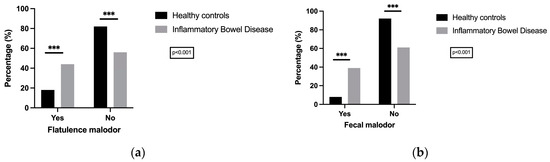 The statistical analysis was conducted using the SPSS Statistics software, version 29.0.1.0 (SPSS, IBM, Armonk, NY, USA), and GraphPad PRISM, version 10.4.0 (GraphPad Software, Boston, MA, USA). The Shapiro–Wilk test was used to assess normal distribution. Categorical outcomes are reported as totals and proportions. For group comparisons of categorical variables, the Bonferroni correction was applied to Fisher’s exact test. Unless otherwise stated, all statistical tests were performed two-sided. Significance levels are indicated in figures as one asterisk for p = 0.05, two for p = 0.01, and three for p < 0.001. Student’s t-test was used for odor-related comparisons of dietary variables within the healthy and IBD groups. Student’s t-test was also used for odor-related comparisons of dietary variables between the groups (healthy vs. IBD). For IBD only, data were further analyzed using binary logistic regression to assess the probability of an association between disease and diet-related events with (a) flatulence malodor and (b) fecal malodor. The odds ratio (OR), 95% confidence interval (CI), and level of significance (p) are reported. To ensure the reliability of the adjusted model, we tested for multicollinearity of the variables associated with each other in the binary logistic regression model. Consequently, the variables GI surgery and Pouch/Stoma were not used simultaneously in the adjusted model. Results of logistic regression analysis (univariate and adjusted (multivariate)) are available as supplementary data (Tables S1 and S2: Adjusted logistic regression analysis of the influence of disease-specific and dietary-specific factors […]). Meanwhile, the results of the fully adjusted multivariate logistic regression are reported on in the results section. Goodness of fit for the fully adjusted logistic regression model with the outcome flatulence malodor was assessed via Omnibus Tests of Model Coefficients (p < 0.001), R2 (Nagelkerkes: 0.485; Cox & Snell: 0.363), and the Hosmer–Lemeshow test (p = 0.459). The model performance was assessed via the classification table, which showed an overall percentage of 81.4%. Goodness of fit for the fully adjusted logistic regression model with the outcome fecal malodor was assessed via Omnibus Tests of Model Coefficients (p < 0.001), R2 (Nagelkerkes: 0.475; Cox & Snell: 0.350), and the Hosmer–Lemeshow test (p = 0.776). The model performance was assessed via the classification table, which showed an overall percentage of 80.5%.