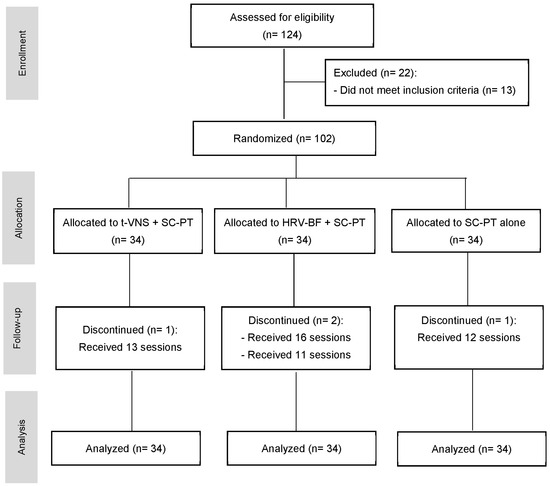 The participants were recruited consecutively and randomly allocated to Group A (transcutaneous VNS plus standard-care physiotherapy), Group B (HRV-BF plus standard-care physiotherapy), or Group C (standard-care physiotherapy alone). The randomization sequence was computer-generated by the principal researcher using GraphPad (http://www.graphpad.com/, accessed on 17 May 2023). A total of 102 numbers were generated, and each number and its corresponding group assignment were concealed in a sealed, opaque envelope.