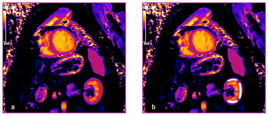 - Messroghli, D.R.; Moon, J.C.; Ferreira, V.M.; Grosse-Wortmann, L.; He, T.; Kellman, P.; Mascherbauer, J.; Nezafat, R.; Salerno, M.; Schelbert, E.B.; et al. Clinical recommendations for cardiovascular magnetic resonance mapping of T1, T2, T2* and extracellular volume: A consensus statement by the Society for Cardiovascular Magnetic Resonance (SCMR) endorsed by the European Association for Cardiovascular Imaging (EACVI). J. Cardiovasc. Magn. Reason. 2017, 19, 75. [Google Scholar] [CrossRef]