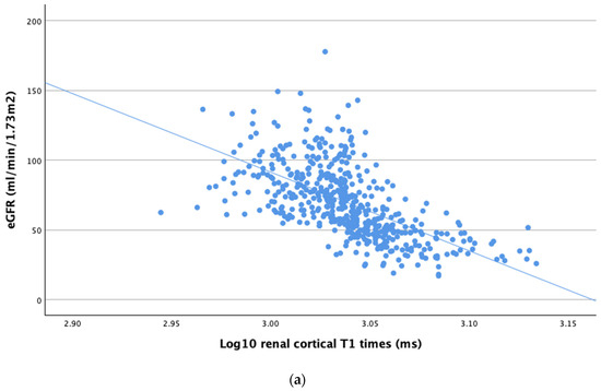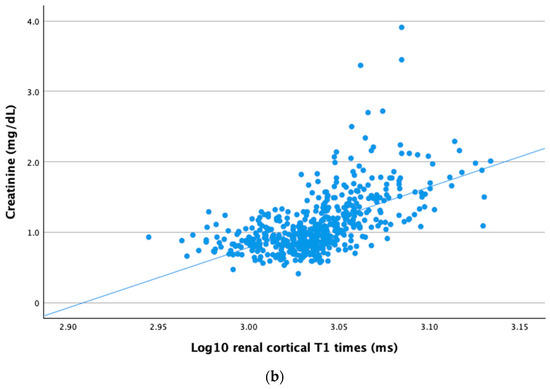 (a) Correlation between log10 renal cortical T1 times and eGFR. (b) Correlation between log10 renal cortical T1 times and creatinine.