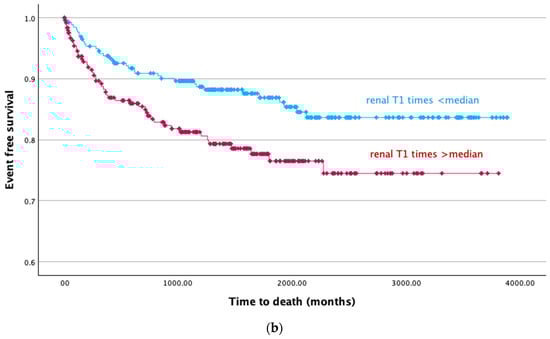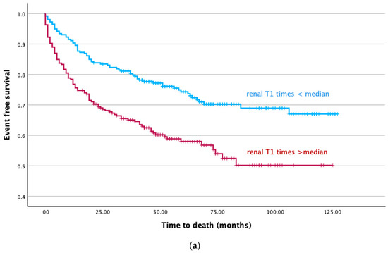 Kaplan–Meier analysis showed an increased risk of all-cause death in patients with renal cortical T1 times above the median (p < 0.001 by log-rank test) (Figure 3a,b). There were 71 events in the group of patients with renal cortical T1 times below the median and 102 events in the group with renal cortical T1 times above the median. Furthermore, Kaplan–Meier analysis showed an increased risk of cardiovascular death in patients with renal cortical T1 times above the median (p = 0.004 by log-rank test). There were 37 events in the group with renal cortical T1 times below the median and 53 events in the group with renal cortical T1 times above the median.
